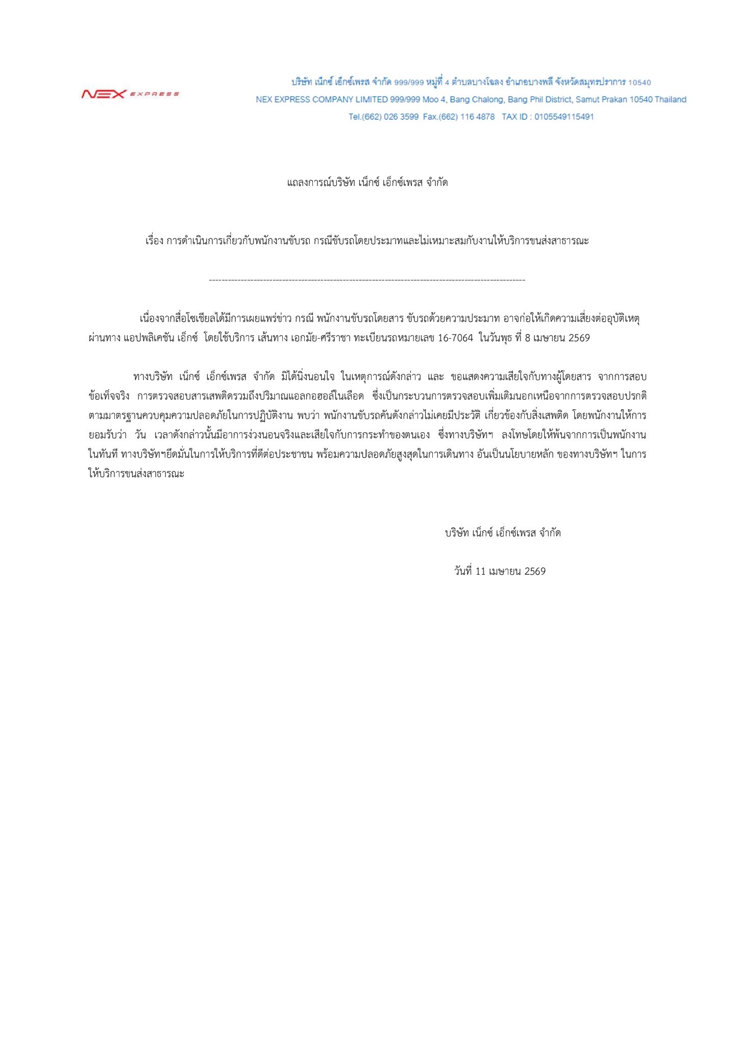 เน็กซ์ เอ็กซ์เพรส แถลงการณ์กรณีพนักงานขับรถมีพฤติกรรมไม่เหมาะสม